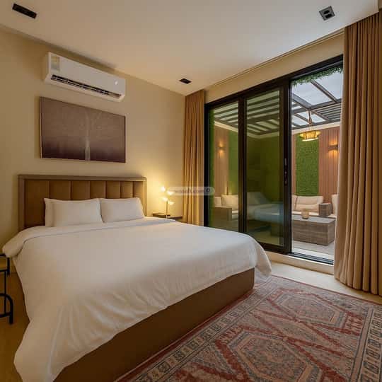 شقة فندقية بتصميم راقي بصالة وغرفة نوم وفناء خارجي