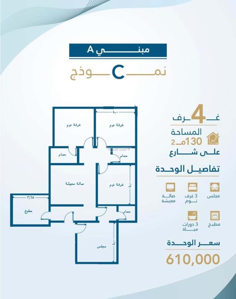 ٤ غرف داخليه مساحة ١٢٨م إلى ١٣٦ م