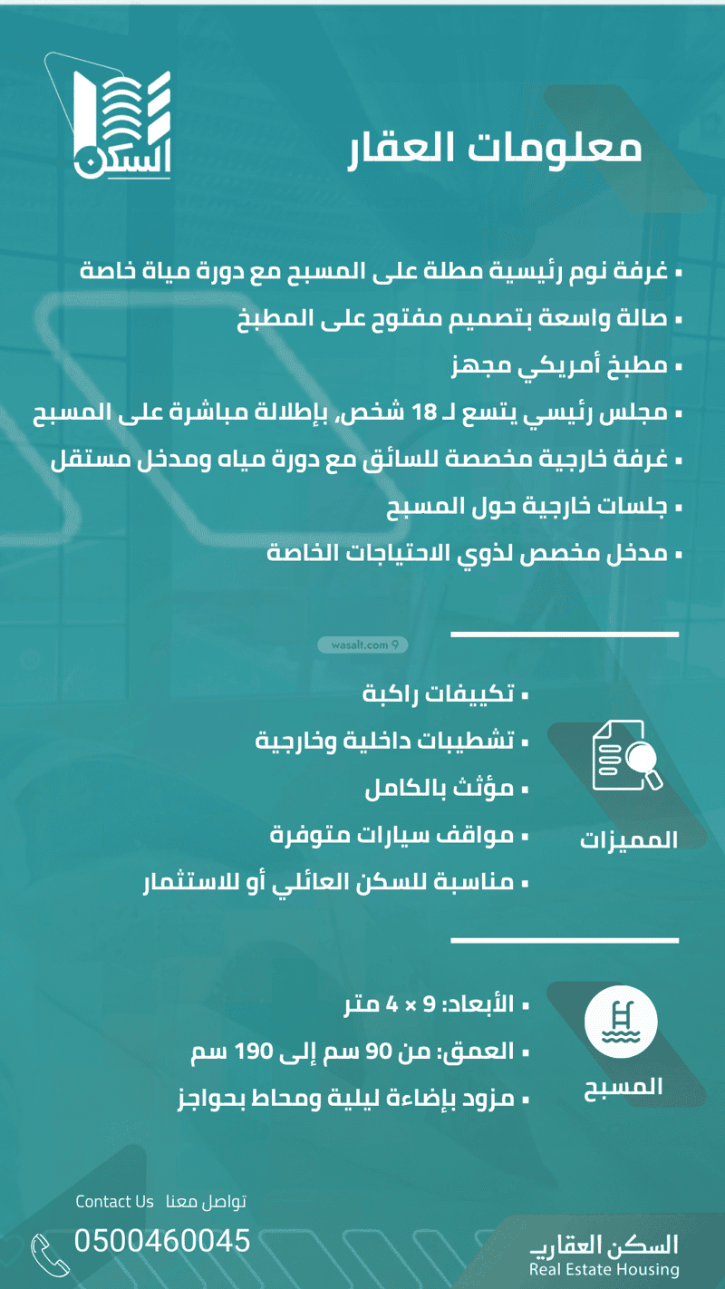 - مجلس رئيسي يتسع لـ 18 شخص، بإطلالة على المسبح