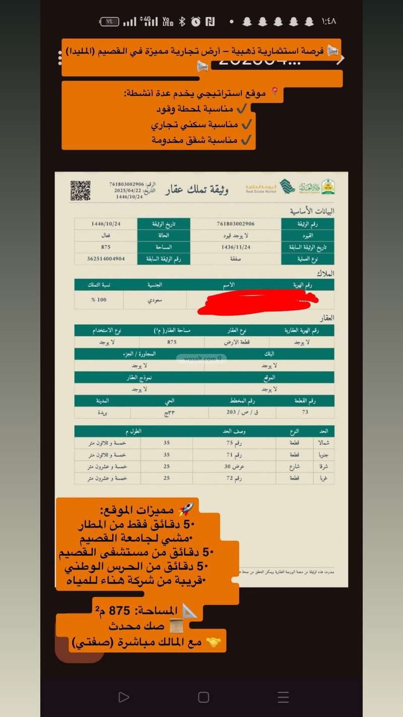 📢 فرصة استثمارية ذهبية – أرض تجارية مميزة في القصيم (المليدا) 📢
