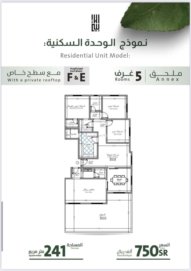 5 غرف +غرفة خادمة بحمام مستقل لها + غرفة ملابس