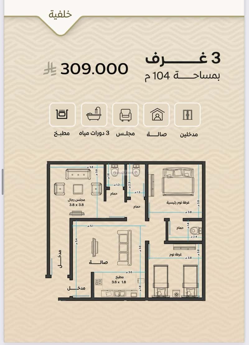 شقه ٣ غرف خلفيه مساحه 104م