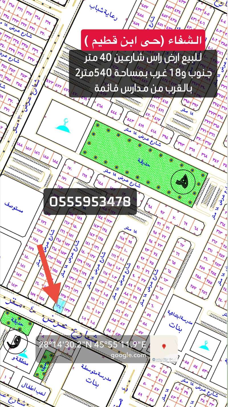 أرض شارع 40 قائم وشارع 18 غرب للبيع في حي الشفاء٬ حفر الباطن بالقرب من مدارس ومستوصف الحي