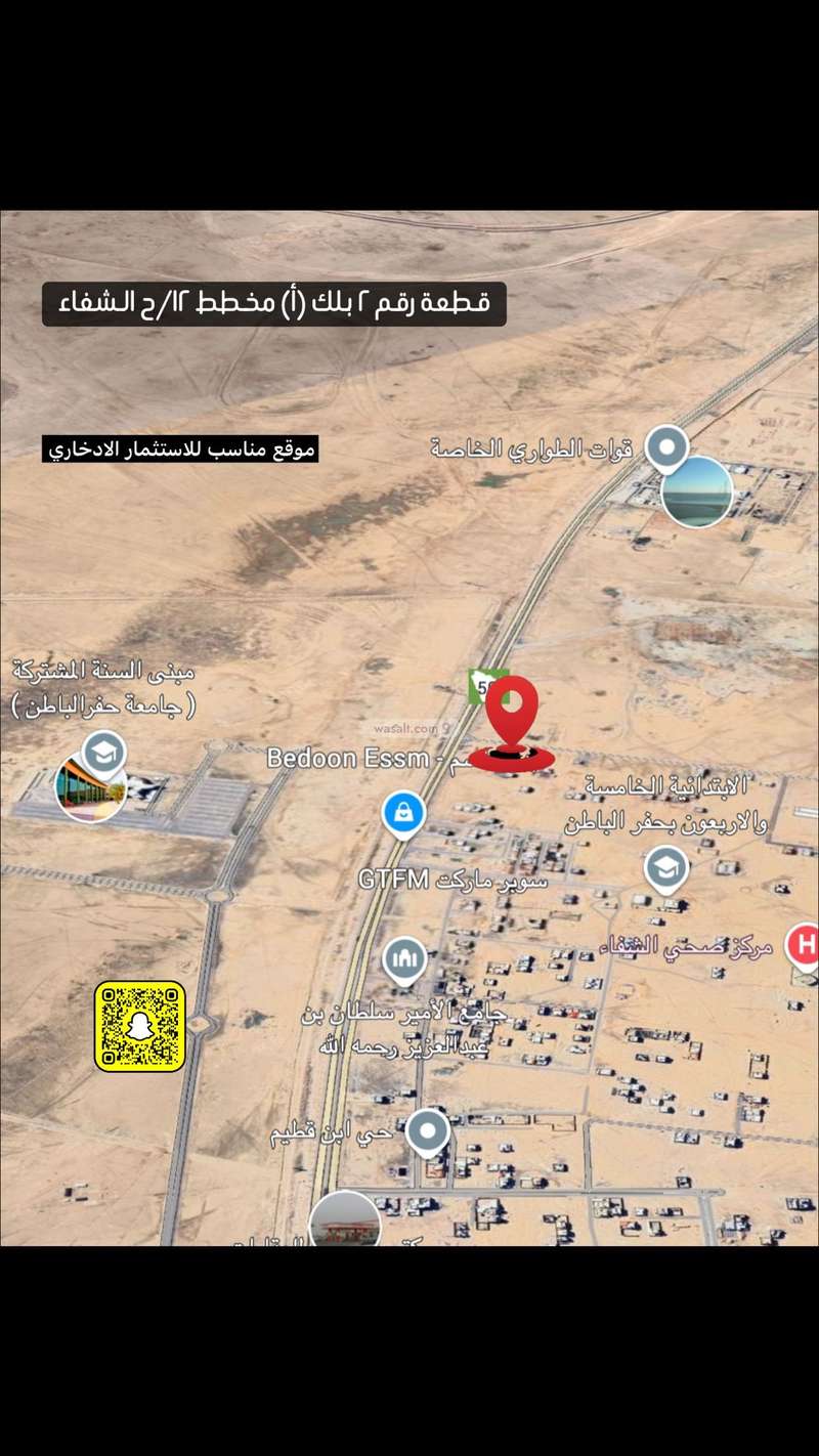 للبيع ارض على شارعين تجارية سكنيه شارع ٤٠ جنوبي قائم بجانب الارض التجارية على شارع الملك عبدالعزيز (طريق الرياض ) وشارع ١٨ غربي بمساحة ٥٦٠ مترمربع في الشفاء الحي المقابل لجامعة حفر الباطن