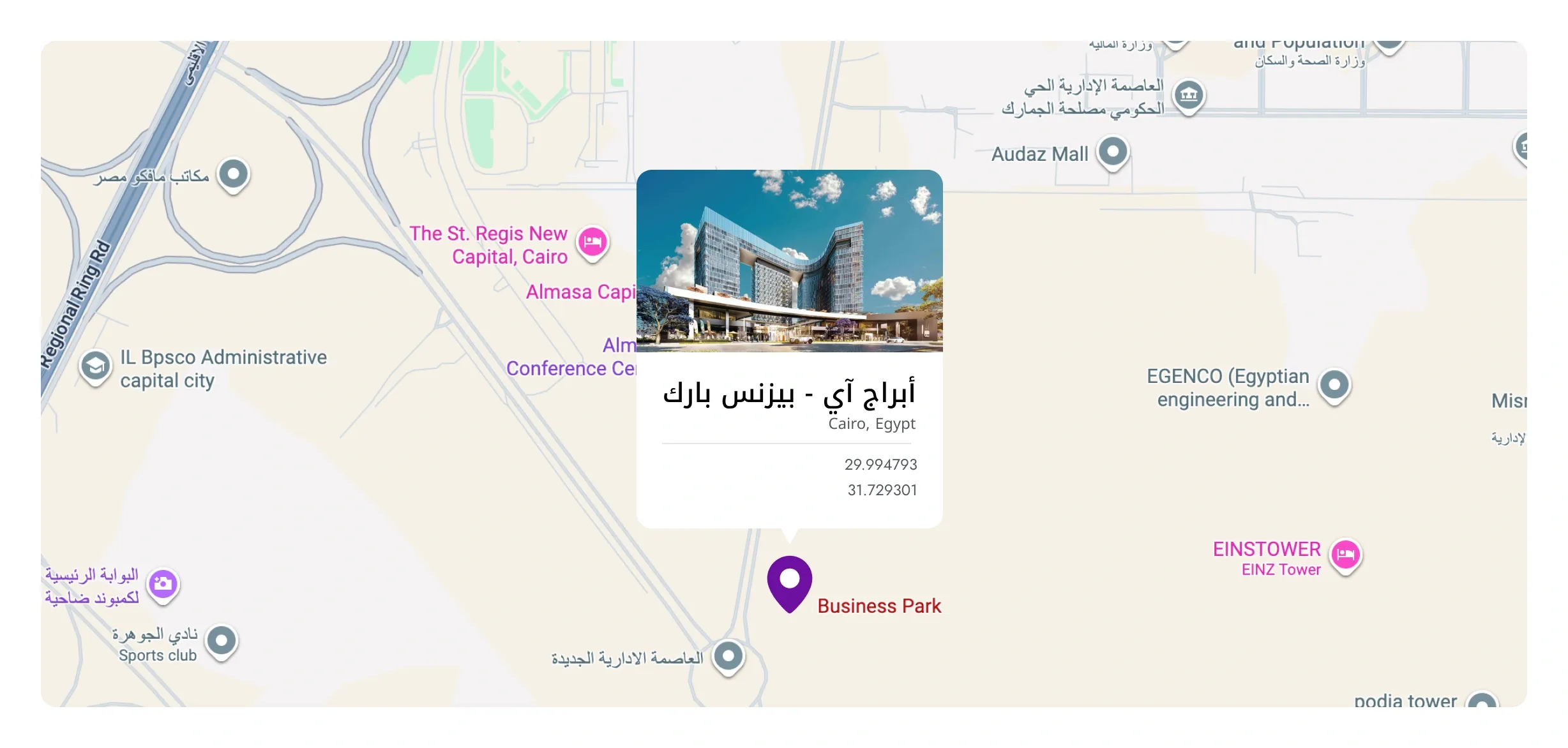 القاهرة، مصريعكس اسم العلامة التجارية "آي بيزنس بارك" هوية المشروع، حرف ال(ا) يرمز إلى أن الأبراج الذكية ولا تباعنا لأحدث التقنيات التكنولوجية، كما يرمز إلى رقم ١ باللغة اللاتينية وهوما يشير إلى بناء مشاريع من الدرجة الأولى من حيث الرقى والجودة، كما أن حرف ال (ا) هو أول حروف الكلمات الإنجليزية innovation, investment and internationalization وتعني بالترتيب؛ الابتكار والاستثمار والعالمية. واخيراً يشير ١ إلى الضمير (أنا) أي أنا العميل أمتلك كل هذه المزايا.