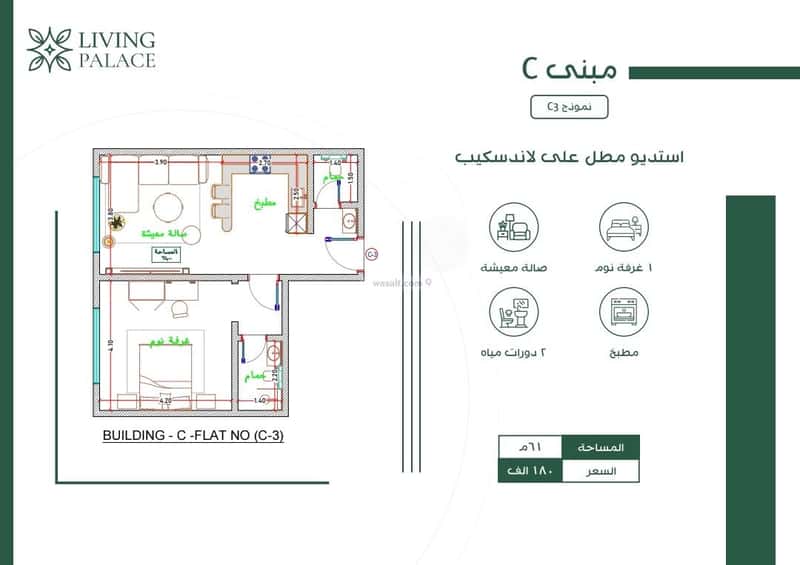 مكونة من: 8 ادوار و 2 غرفة و 2 دورة مياه و 1 صالة