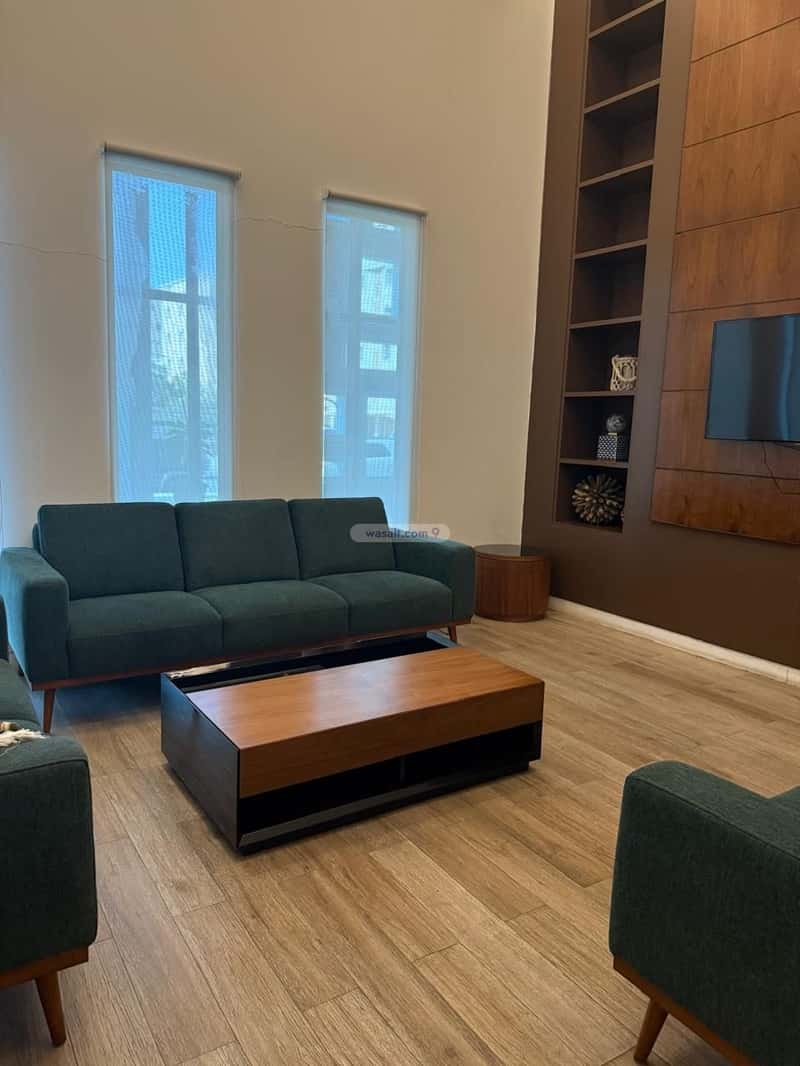 الصالة مفتوحة تتسع لجلستين رئيسيتين مع منطقة طعام متصلة، مع نوافذ كبيرة تطل على منظر حي النهضة .