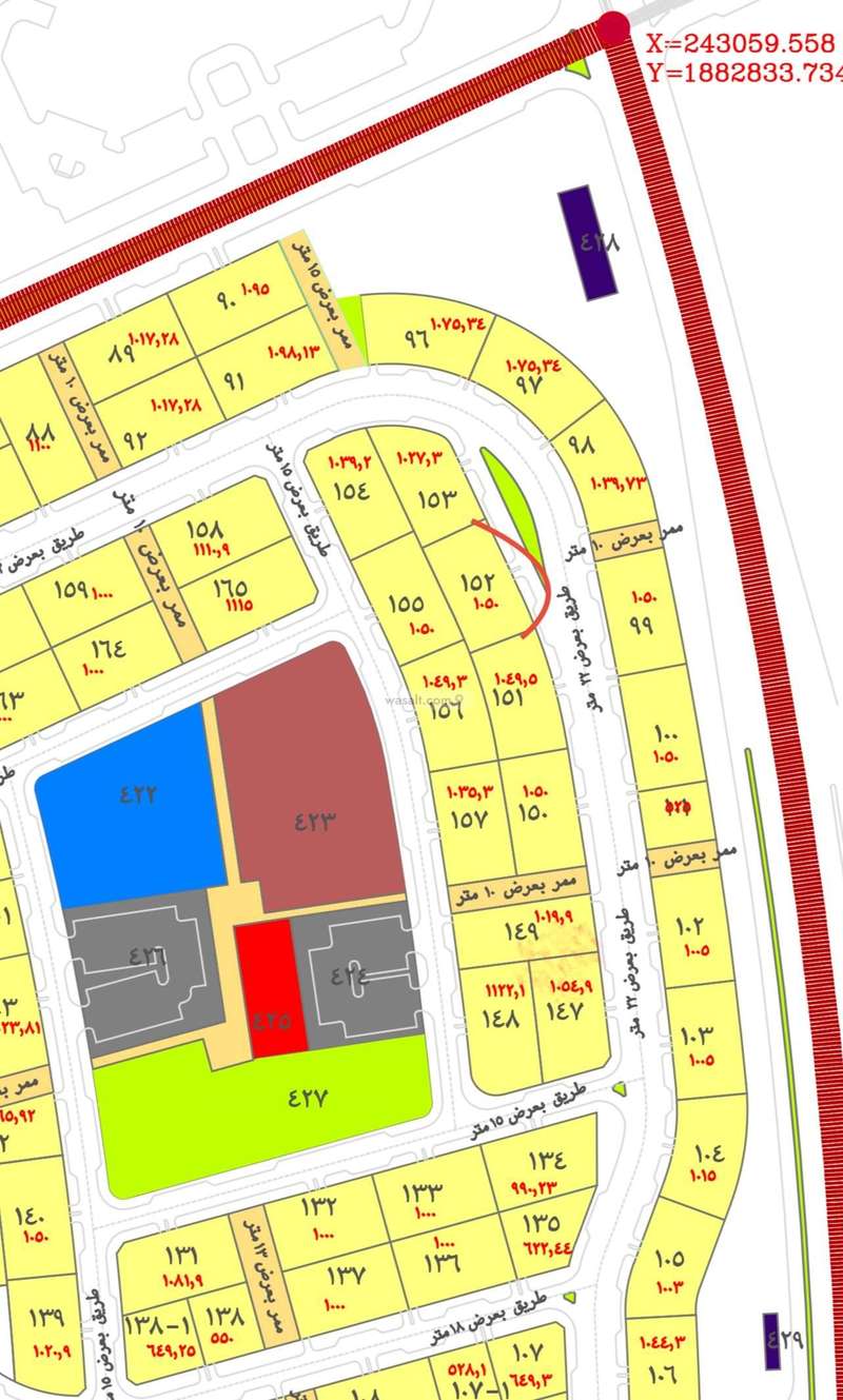جنوبا : قطعة رقم ١٥١ بطول ٢٥ م