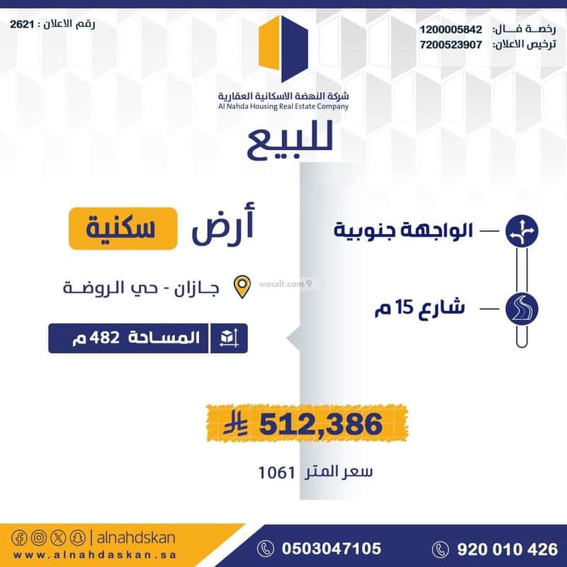 ارض للبيع جازان حي الروضة الغرض من العرض : البيع المساحة : 482.73م الواجهة : جنوبية شارع : 15م السعر : 512,386.01 سعر المتر : 1,061.43 رقم الترخيص : 7200523907 رقم الإعلان : 2621 للتواصل والاستفسار : 0503047105 خدماتنا✨🔸تسويق عقاري احترافي🔸احتساب أعلى تمويل أفضل عروض البنوك🔸تعاملنا مع إدارات البيع المباشر يضمن لك أقل هامش ربح بالمملكة🔸 تأمين الدفعات المقدمة🔸سداد وتوحيد المديونيات🔸إمكانية التضامن لرفع قيمة التمويل🔸 إدارة أملاك🔸 النهضة الاسكانية العقارية اختيارك الأمثل لتملك عقارك وإنجاز أعمالك والتسويق وإدارة الأملاك