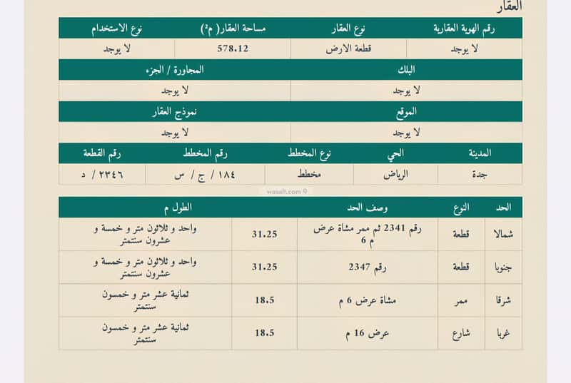 قطعة سكنية للبيع في جدة مخطط الرياض جزء د رقم ٢٣٤٦ مساحة ٥٧٨م شارع غربي،١٦م وممر شرقي،٦م المطلوب ٦٥٠ الف صافي