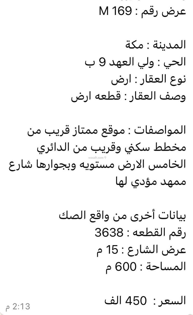 أرض 600 متر مربع شمالية على شارع 15م