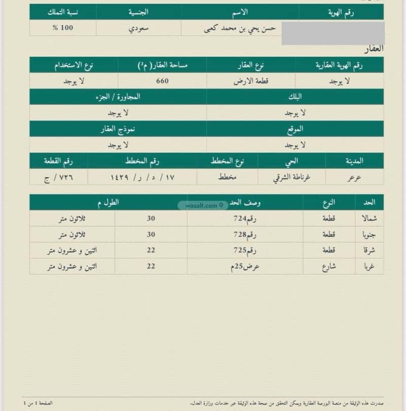 مساحة الأرض 660 متر مربع