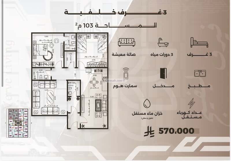 مكونة من 3 غرف مساحه 103م