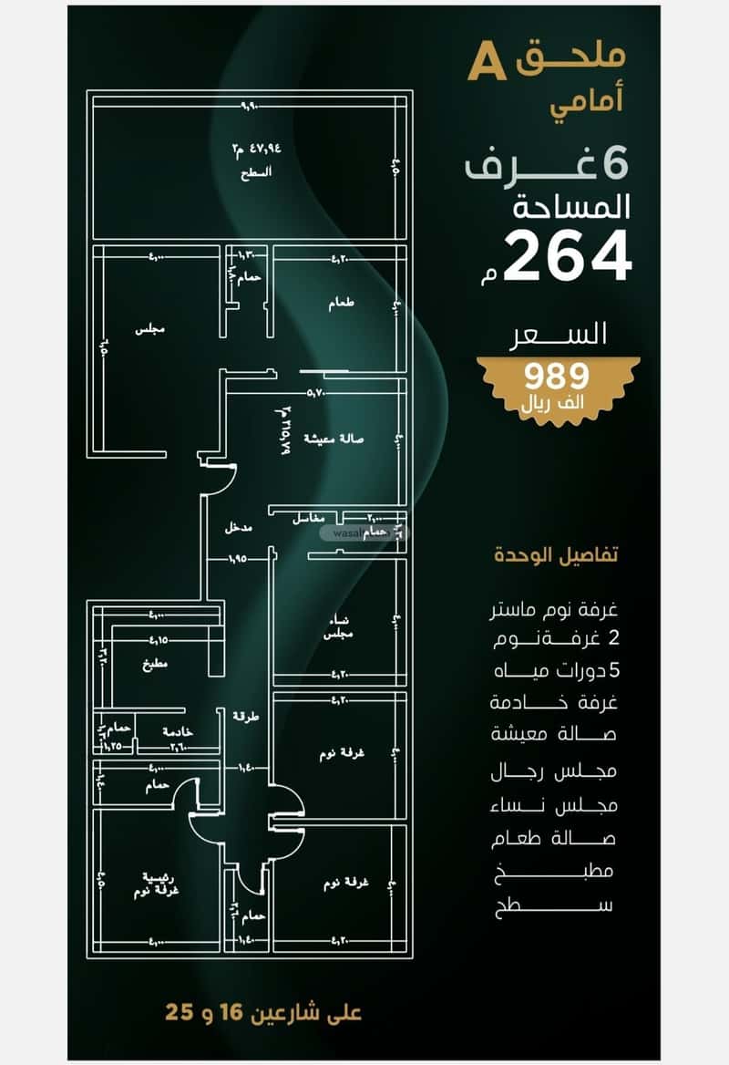مكونة من: 5 ادوار و 4 غرف و 3 دورات مياه و 1 صالة و 1 مجلس