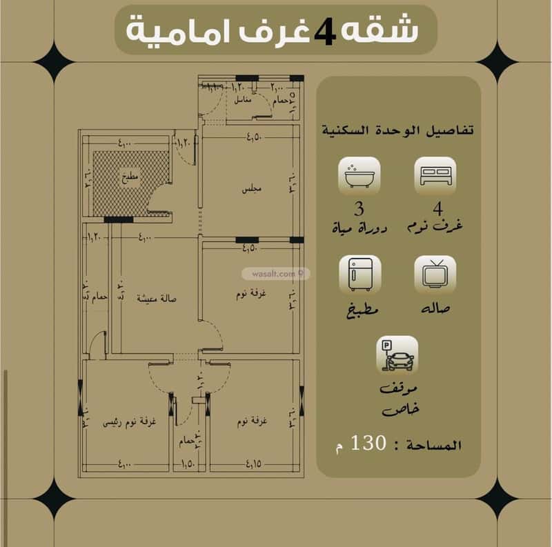 مكونة من: 5 ادوار و 4 غرف و 3 دورات مياه و 1 صالة و 1 مجلس