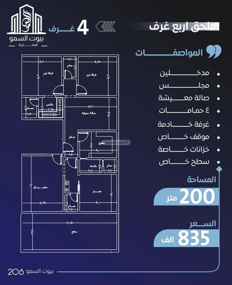 مكونة من: 4 غرف و 3 دورات مياه و 1 صالة و 1 مجلس