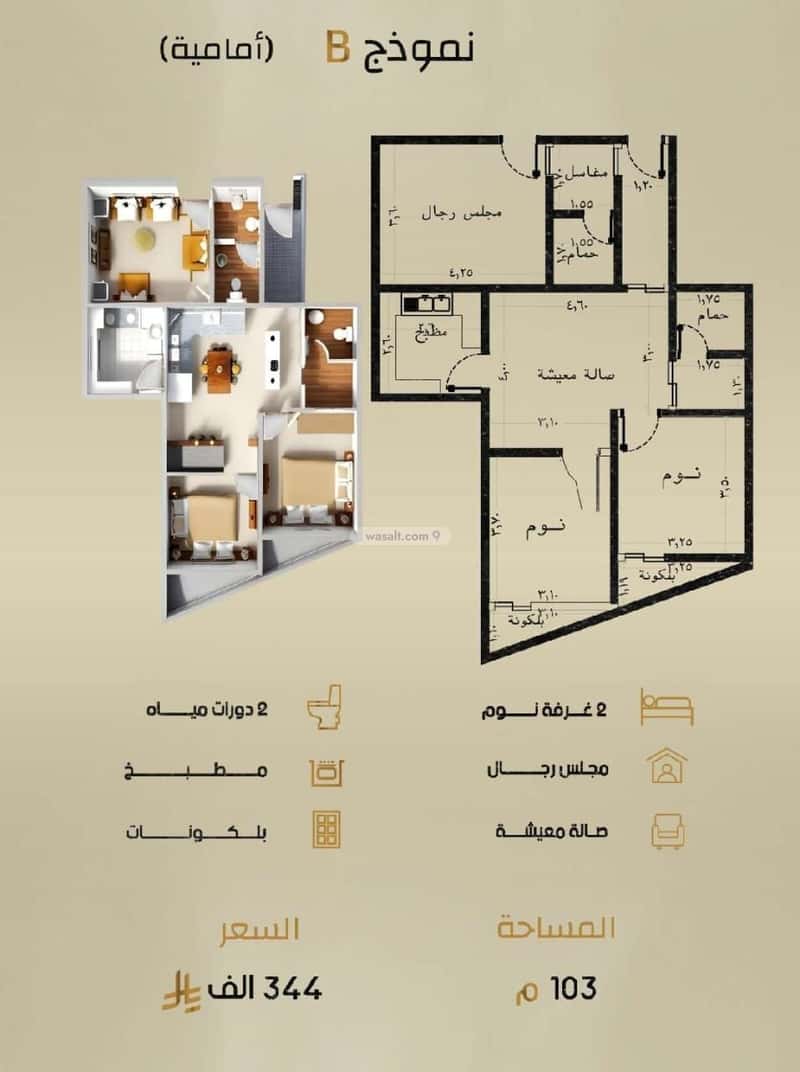 مكونة من: 5 ادوار و 3 غرف و 3 دورات مياه و 1 صالة و 1 مجلس