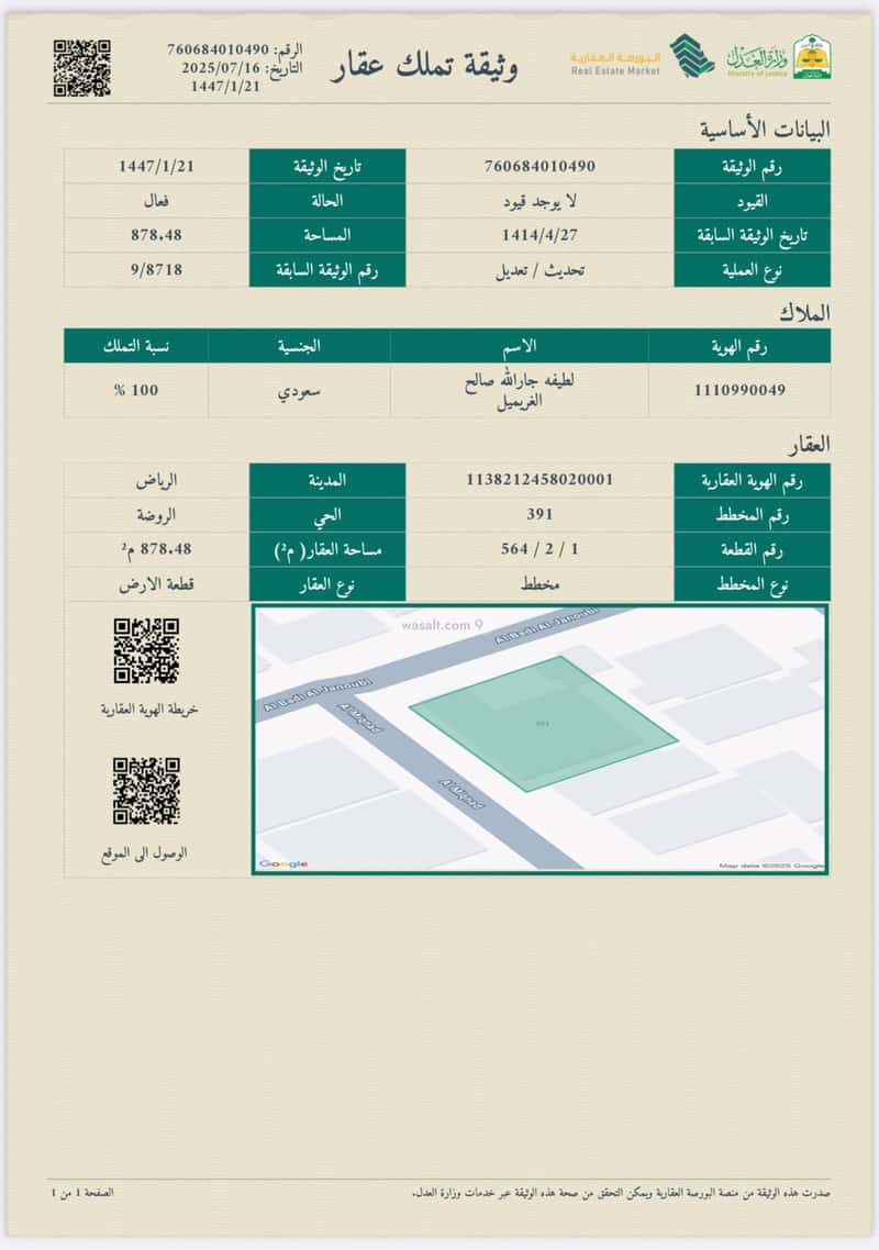 بيت هدد في وقع استرتيجي وحي سكني راقي. قريب من جميع المواقع اللحيوية والاستراتيجيه المراكز التجارية كارفور، العثيم، البريد السعودي، جامع وحديقة الروضة مترو خريص. فرصة لبناء وحدات سكنية استثمارية. تقع على ش ٢٠ شمالي نافذ على الثلاثين و ١٥ غربي. المساحة ٨٧٨م٢. عليها سومة سابقه ٦٥٠٠ للمتر والبيع قريب من سعر السومه اعتذر للوسطاء.السعر غير شامل الضريبة والسعي.