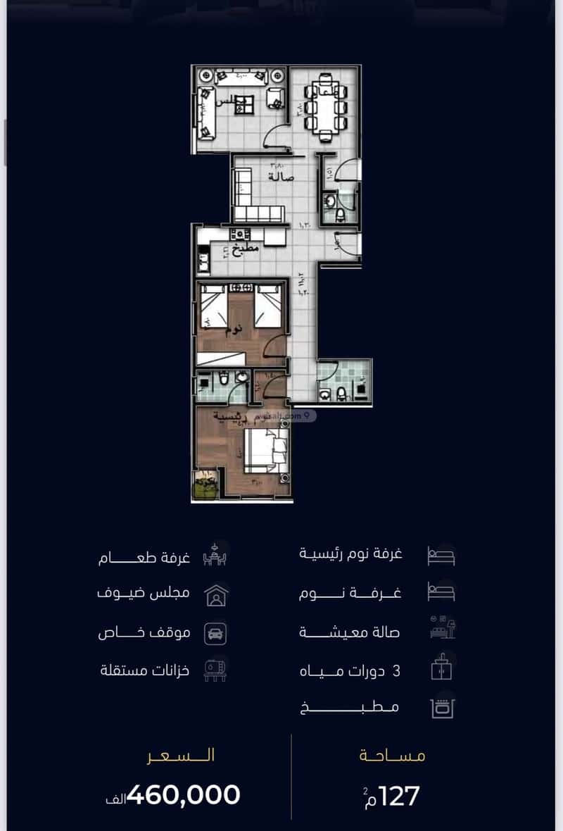 تتكون الشقه من ٤ غرف مساحه ١٢٧م