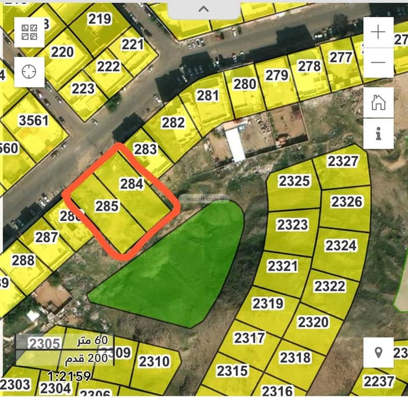 رقم القطعة : 285 ، المساحة : 1000 م2 ، السعر : 2000 ريال /م2