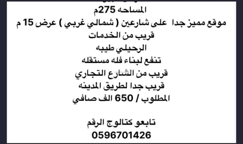 موقع مميز جدا على شارعين ( شمالي غربي ) عرض 15 م